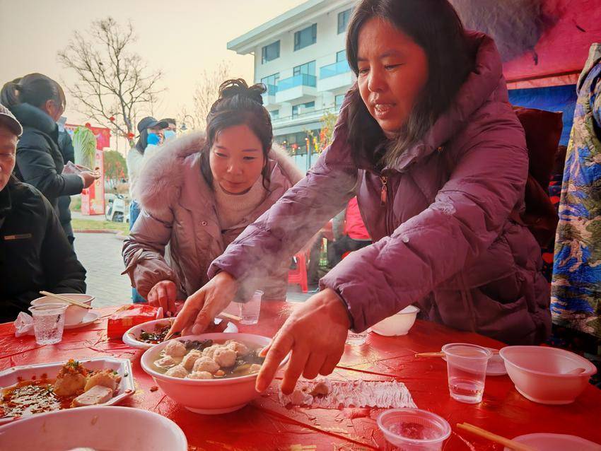 活动现场,村民熟练地宰杀处理土猪,现场制作农家菜肴。宾客们围坐长桌,共享热气腾腾的“年猪饭”,欢声笑语中尽显团圆氛围。互动环节更是精彩纷呈:村民划起采莲船、敲响喜庆腰鼓、演绎“蚌王精”民间故事,宾客们积极参与打糍粑等年俗体验,沉浸式感受传统年味。