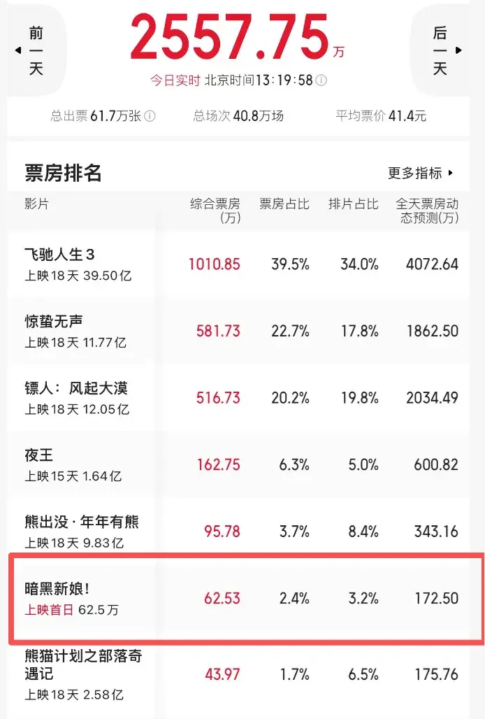 周五了,但截止到了现在,单日总票房还停留在2557万,前天和昨天分别是八千万和六千万,今天估计也破不了亿。